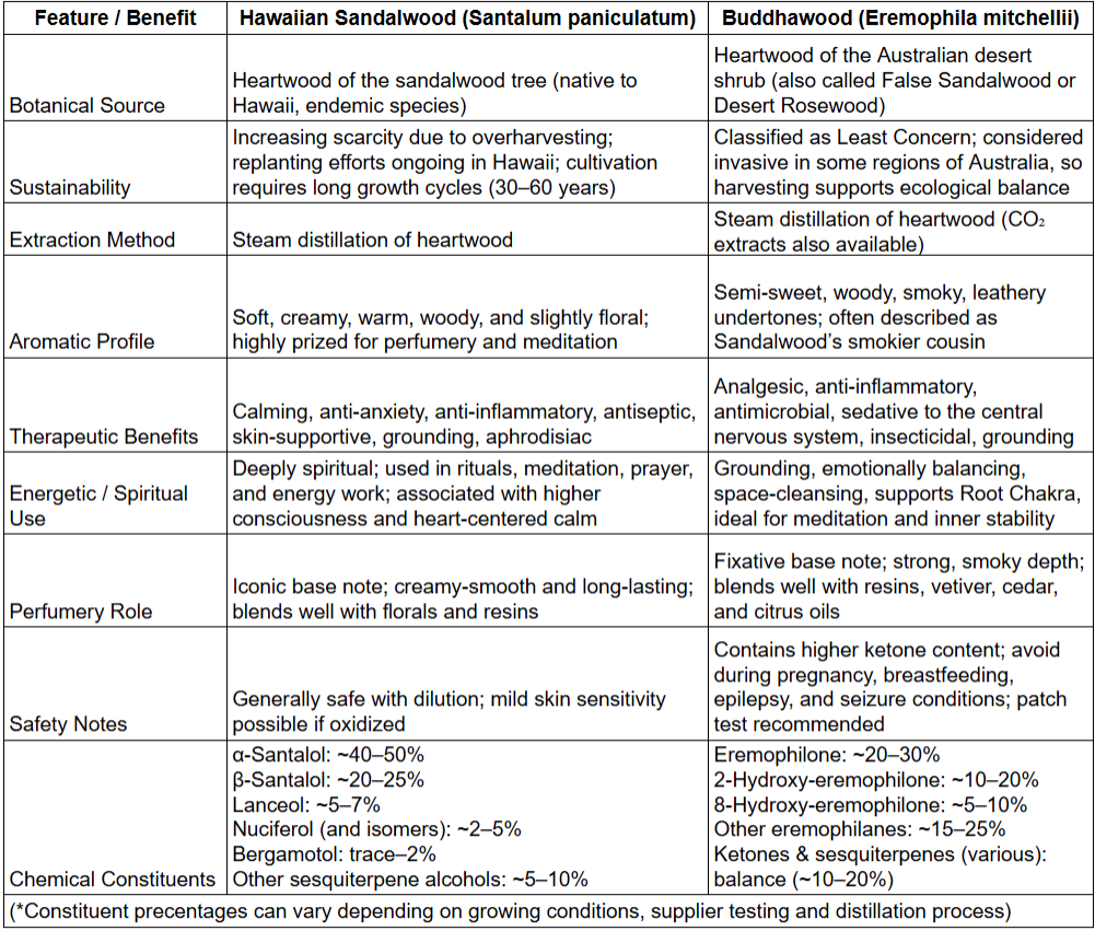 At first glance, the name itself captured my attention as a Yoga Therapist—it resonated with themes of mindfulness and meditation. As I began researching, I noted aromatic and regional similarities to Australian Sandalwood, which only deepened my curiosity. What I uncovered is that Buddhawood is not only a fascinating aromatic in its own right but also one of the most highly recommended substitutes for Sandalwood, particularly Royal Hawaiian Sandalwood.